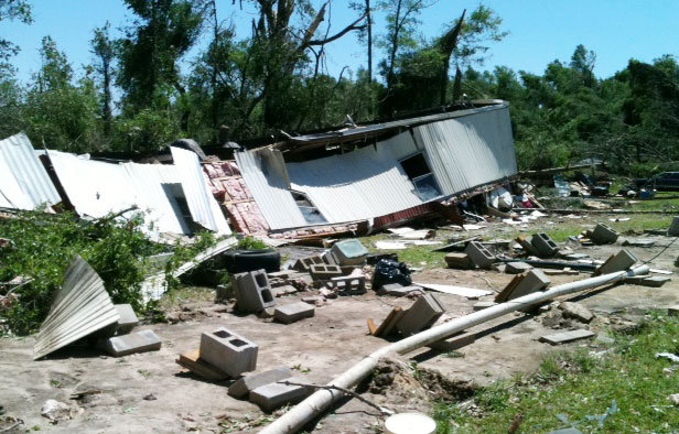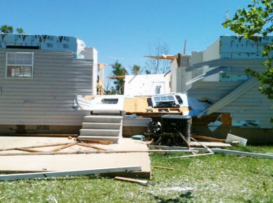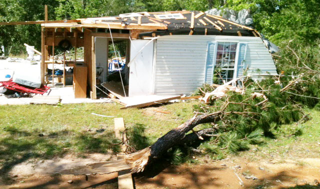 Pictured top: This mobile home overturned twice in the Damascus community of Escambia County, Ala. Pictured inset: Another home damaged on Damascus Road. Pictured below: A damaged home on Highway 31 north of Brewton. Submitted photos by the American Red Cross East Escambia Chapter for NorthEscambia.com, click to enlarge.