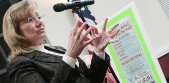 Pictured: Repton (Ala.) Mayor Terry Carter explains her position against the landfill to the Century Town Council earlier this year. NorthEscambia.com file photo, click to enlarge.