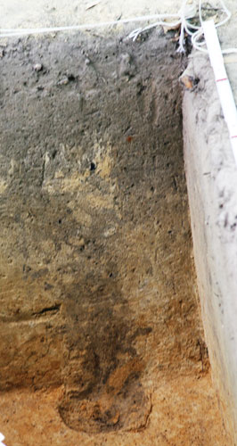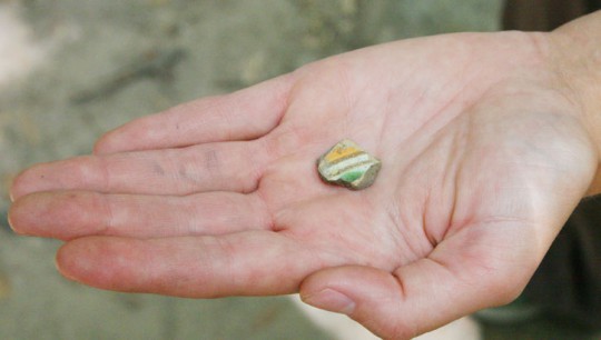 Finds include a sherd of Mexican-made majolica, probably Abó Polychrome, with a colorful surface glaze (pictured top) and physical features such as the post hole pictured to the left (indicated by the darker remains extending downward). A necklace bead was located that dated between 1700 and 1800 that was possible made in Amsterdam – a common item on period Spanish colonial sites. Common items such as lead shot and a straight razor have also been uncovered.