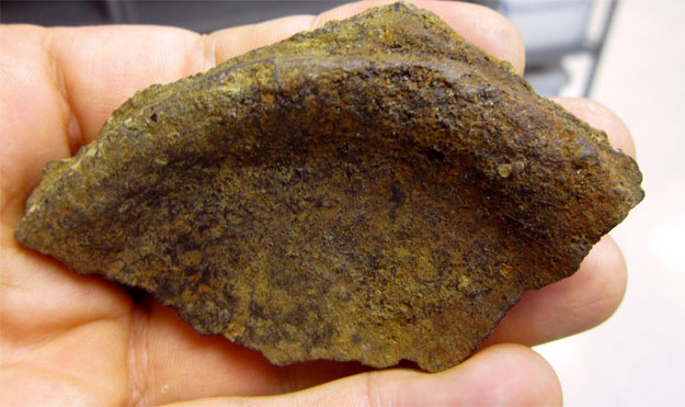 A large Native American piece with a foot-ring base, a relatively rare piece to be found on mission site, that was designed to be used on a flat table. The sherd is what archeologists term colono ware — Native-American ceramics that are crafted in European forms.