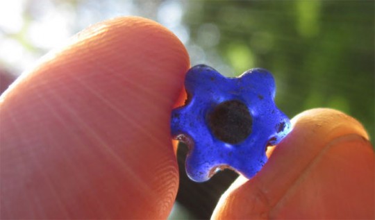 An unusual glass necklace bead found in Molino, believe to possibly be an 18th-century “melon bead” with a translucent cobalt blue color.