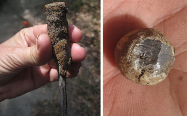 A well preserved large wrought iron nail or spike (pictured left) and ( right) a lead musketball that is about 59 caliber.