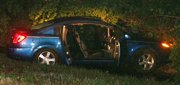 Pictured above: A McDavid man was struck and killed by two log trucks on Highway 29 in Bluff Springs about 2:35 Thursday morning. Pictured inset: The victim’s car was at the edge of a wooded area, perhaps involved in an unrelated single vehicle crash prior to his death. Pictured below: The victim was first hit by the white log truck pictured, then by a second yellow log truck pictured at the bottom of the page . NorthEscambia.com exclusive photos, click to enlarge.