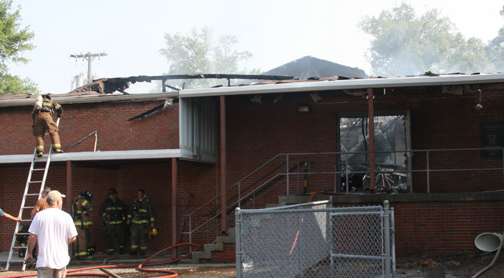 Pictured above and inset: These exclusive photos from inside the Pollard McCall School Media Center shows extensive damage as firefighters work to extinguish remaining hot spots. Picture below: The fire was contained to the media center building. NorthEscambia.com photos, click to enlarge.