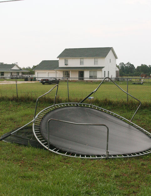We left home with everything in place. We came home to a mess!! There where limbs (not small ones either) all oer the yard and a split Oak tree with the limb laying on the house. Did not puntucre any holes, how lucky we were. The limbs that where taken out of the trees, went about half way across the yard. Looked like we got about 2″ inches of rain and quick from what we saw and where told. Tornado or not, we were lucky considering how close everything was a months ago in the McDavid area.