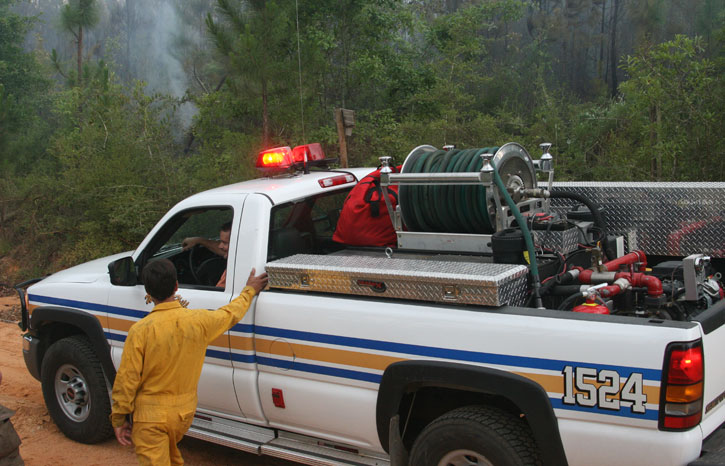 The fire department volunteers spent about 20 minutes trapped in their fire truck as they waited for Gulf Power to arrive and cut power to the electrical system in the area. As they waited, power lines could been seen near the truck arcing and causing tree limbs to smolder.