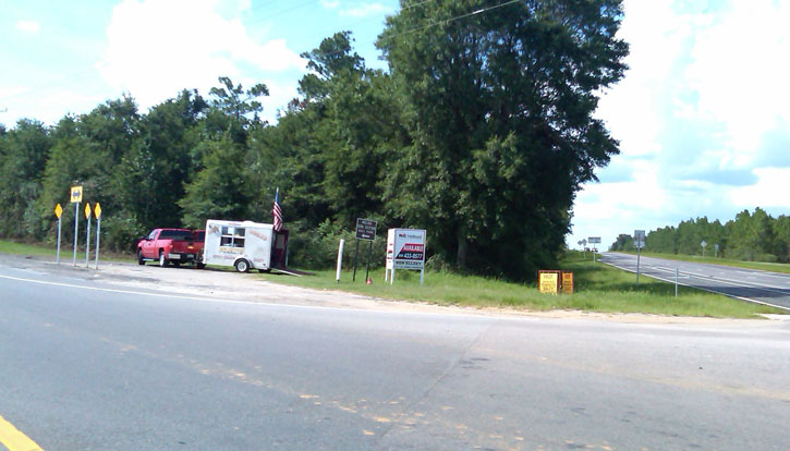 Pictured above: Preliminary plans are underway for a fast food restaurant at the intersection of Highway 29 and Highway 97 in Molino. Pictured below: The restaurant is planned across Highway 97 from the Tom Thumb. NorthEscambia.com photo/graphic, click to enlarge.