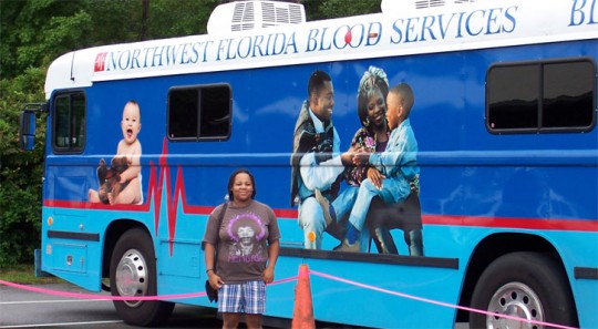 Pictured above: Ava Myles is reading to donate blood this afternoon at the Northwest Florida Bloodmobile at the Century Town Hall. The Bloodmobile will be open until 7 p.m. Submitted photo for NorthEscambia.com, click to enlarge.