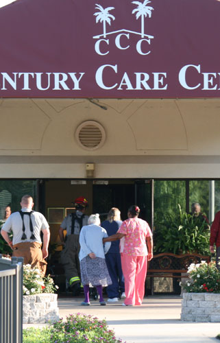 Pictured above and below: Several fire departments responded to a small fire at the Century Care Center. Pictured inset: Residents are escorted back inside the facility following a brief evacuation. NorthEscambia.com photos, click to enlarge.