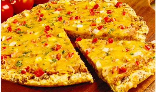 Spread crust with refried beans. Top with onions, tomato, cilantro and cheese. Bake for an additional 10 to 15 minutes or until cheese is melted.