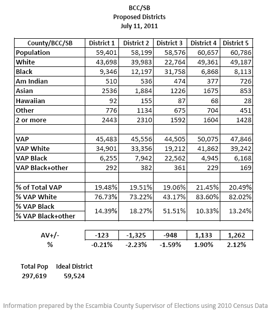 Escambia County is divided into five different voting districts, each represented by a county commissioner and school board member. According to County Administrator Randy Oliver, the districts must be redrawn in such a manner that the population difference between the smallest district and the largest district is no more than five-percent.