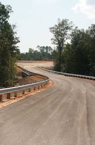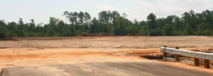 Pictured top: Work is about 70 percent complete on a half million expansion at the Cantonment Athletic Park. Pictured inset: A paved entrance road from the back of the existing park leads across a culvert to the new addition. NorthEscambia.com photos, click to enlarge.