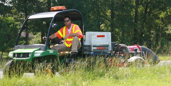 Pictured above and below: A crew from Transfield Services uses a high power blower to remove loose rocks from Highway 29 near McDavid over the weekend. Work will continue through Tuesday. NorthEscambia.com photos, click to enlarge.