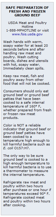 The USDA advises all consumers to safely prepare their raw meat products, including fresh and frozen, and only consume ground beef that has been cooked to a temperature of 160° F. The only way to confirm that ground beef is cooked to a temperature high enough to kill harmful bacteria is to use a food thermometer that measures internal temperature.