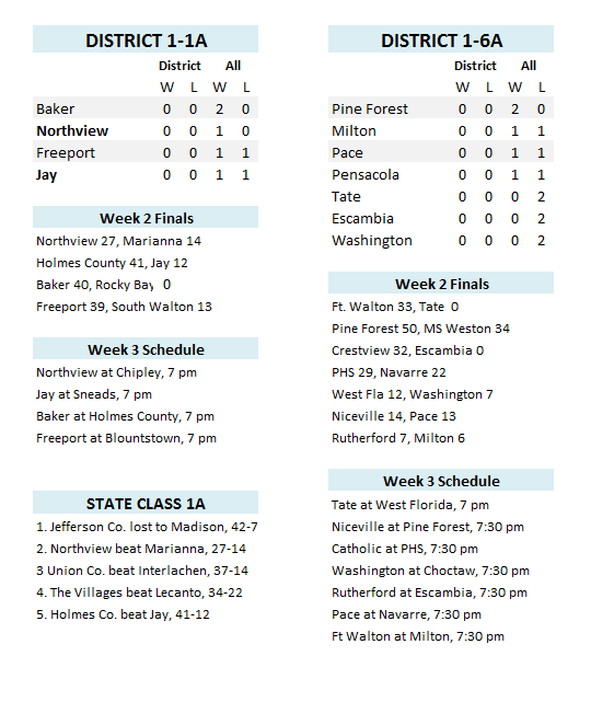 In the North Escambia area, Northview is 1-0, Jay is 1-1 and Tate is 0-2 on the season.