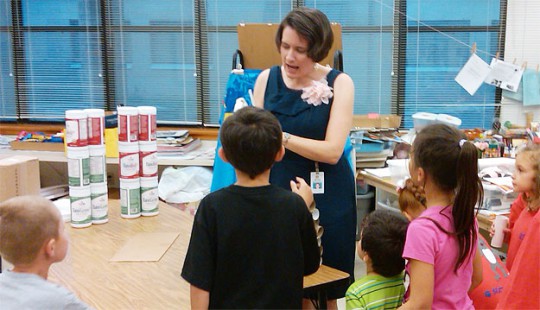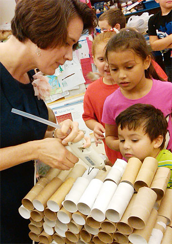 Pictured: Students attending the open house at Bratt Elementary School Thursday night took part in an art class project to build a robot out of recyclable materials with the help of art instructor Meredith Roberts. NorthEscambia.com photos, click to enlarge.