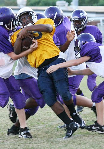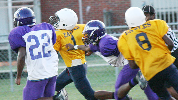 Pictured top: Jacob Dunsford gains yardage for the Ernest Ward Middle School Tuesday evening in Walnut Hill. Pictured inset: Isaiah Dunn doesn’t go down without a fight. Pictured below: Desmone Knight (#1) on the move for the Eagles. NorthEscambia.com photos, click to enlarge.