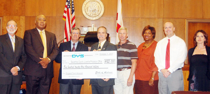 Pictured: Judge David Jordan receives a $123,000 grant to the Children’s Police Council from Walter Wood, director of the Alabama Department of Youth Services. (L-R) Allen Peaton, deputy director of DYS, Turner Sims, DYS, Walter Wood, Judge David Jordan, Rep. Alan Baker, Liletta Jenkins, Alabama Department of Children’s Services, John Fountain, Escambia County Juvenile Probation Officer and Misty Kelly, CPC. Submitted photo for NorthEscambia.com, click to enlarge.