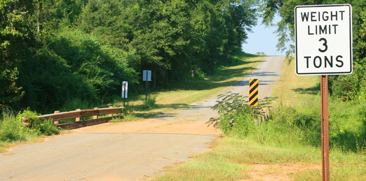 The Hanks Road bridge over Breastworks Creek had a posted weight limit of 20 tons about a week ago; now that weight limit is just three tons, preventing most traffic except for passenger cars and trucks from passing over it. Due to the weight limit, the bridge is now off limits to many vehicles, including school buses, fire trucks and farm equipment.