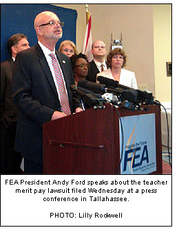 A lawsuit filed in circuit court in Leon County by the Florida Education Association says the merit pay law that ties the salaries of teachers and other school employees to student performance on tests is unlawful because it violates a right to collectively bargain for wages, contracts and promotions that is guaranteed in the state constitution.