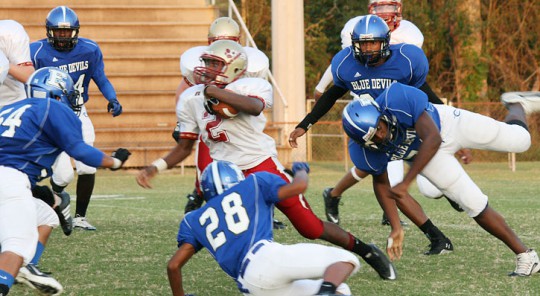 Pictured top: Northview sophomore Brannon Freeman takes down an ECHS Blue Devil Monday evening in Atmore. Pictured inset: Freeman and Phillip Myrick gain yardage for the Chiefs. Pictured below: Northview’s Jaron Myles (#2) maneuvers through a host of ECHS Blue Devil defenders. NorthEscambia.com photos, click to enlarge.
