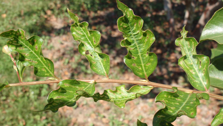 Rabbit tracks is a nutritional disorder most often affecting the crape myrtle cultivars Natchez, Miami, Muskogee, and Tuskegee. The disorder causes elongated spots on either side of the leaf mid-vein during the second growth flush of the spring. Leaf margins may also be distorted.