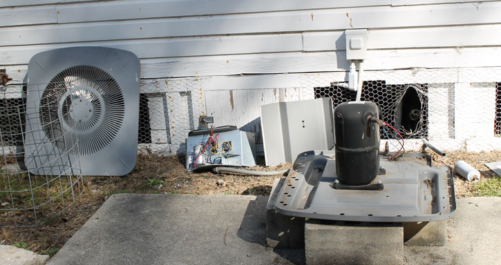Pictured top: An Escambia County Sheriff’s Office crime scene technician looks for fingerprints on a destroyed air conditioning unit at the Davisville Community Center Saturday morning. Pictured inset and below: Two units were dismantled and stripped of copper coils. NorthEscambia.com photos, click to enlarge.