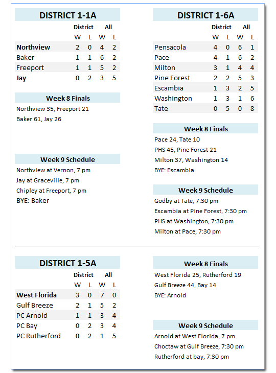In District 1-6A, the Pensacola High School Tigers are district champions if they beat Escambia or Washington. Second place will go to Pace, Milton or Pine Forest depending the outcome of several different games