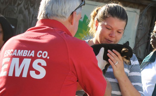 Firefighters found three puppies in the house suffering from smoke inhalation and rushed them outside to a waiting EMT from Escambia County EMS. With the help of other first responders, the EMT administered oxygen and performed CPR on the puppies. Slowly, one of the puppies began to breathe normally and was returned to the its owner. A second puppy was breathing poorly, the human-size oxygen mask too big for its tiny face. The EMT improvised, cutting a water bottle for a perfect puppy fit.