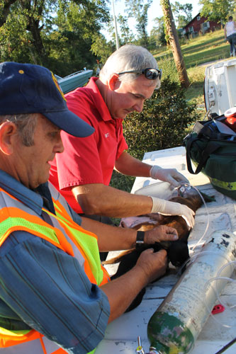 Pictured top: A puppy saved from a Friday afternoon fire in Century is returned to its owner. Pictured inset: First responders administer oxygen and perform CPR on two puppies. Pictured below: An improvised oxygen mask made from a water bottle is used on a tiny puppy. NorthEscambia.com photos, click to enlarge.