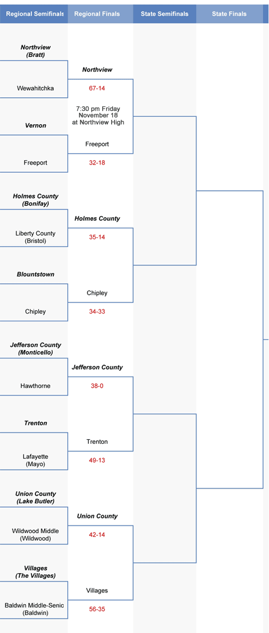The winner of the Northview vs. Freeport game will take on the winner of Friday night’s Holmes County vs. Chipley game in the state semifinals on Friday, December 2. If Northview beats Freeport, the game will be played at home in Bratt. Northview did not play Holmes County during the regular season and lost to Chipley 34-27.