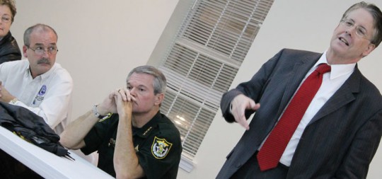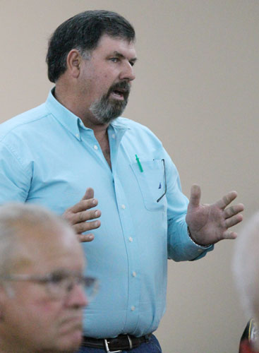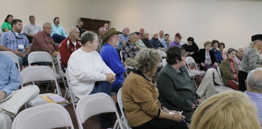 Pictured top: Escambia County District 5 Commissioner Kevin White (left) and Escambia County Sheriff David Morgan listen as Escambia County Administrator Randy Oliver answers questions during a town hall meeting Tuesday night in Walnut Hill. Pictured inset: Brett Ward of Walnut Hill speaks during the meeting at the Walnut Hill Community Center. Pictured below: Audience members listen during the town hall meeting. NorthEscambia.com photos, click to enlarge.