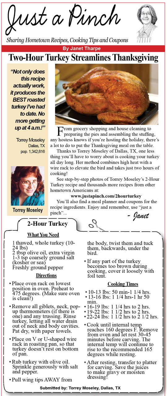 Today’s featured recipe, from columnist Janet Tharpe, is a Two-Hour Turkey that quickly roasts the turkey in the oven at a high heat.
