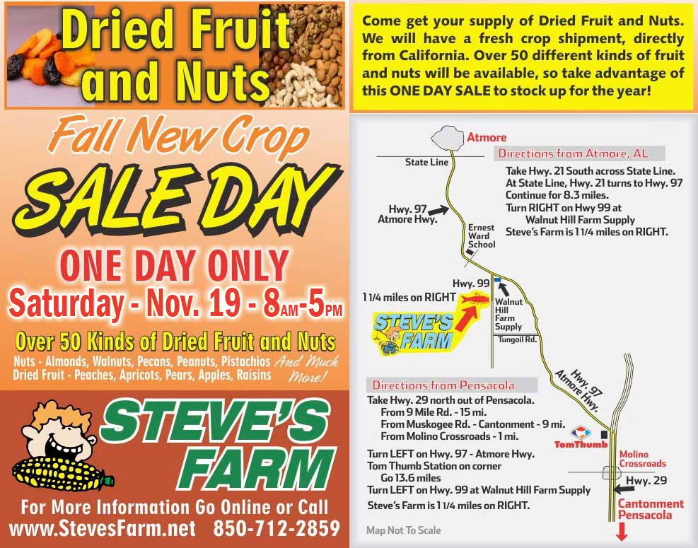 Fresh crop sale of dried fruits and nuts, direct from California. Over 50 different kids of fruits and nuts will be available 8 a.m. until 5 p.m. during this one day sale at Steve’s Farm, Highway 99 1.25 miles south of Highway 97 in Walnut Hill. Click here for more info.