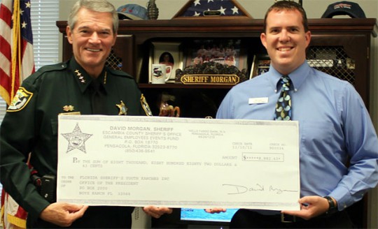The recent Escambia County Sheriff’s Office “In Hot Pursuit 5K” raised $8,882.43 for the Florida Sheriff’s Youth Ranches. Over 230 runners and walkers took part in the annual 5K on Pensacola Beach. Pictured: Sheriff David Morgan presents the 5K proceeds to John Szaroleta of Florida Sheriff’s Youth Ranches. Submitted photo for NorthEscambia.com, click to enlarge.