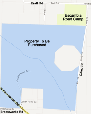 Pictured top: The property to be purchased by Escambia County is near the county road camp at Camp and Bratt Roads. Pictured inset: This NorthEscambia.com graphic shows the property bounded by Camp Road to the east, Pine Barren Road and Breastworks Road to the south.