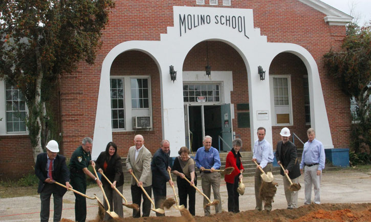 Pictured top: Groundbreaking Monday morning in Molino for the renovation of the old Molino School into a library and community center. NorthEscambia.com photos, click to enlarge.