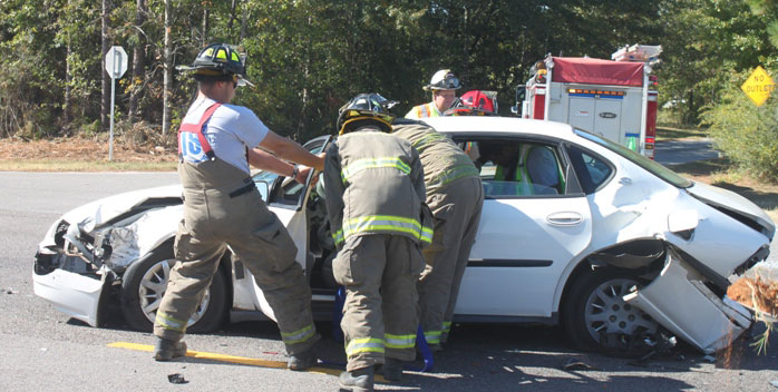 Pictured top: Firefighters work to remove a patient from a wrecked vehicle Saturday morning at Highway 29 and Stout Road near Cantonment. Pictured below: One of three vehicles involved in the crash. NorthEscambia.com photos, click to enlarge.