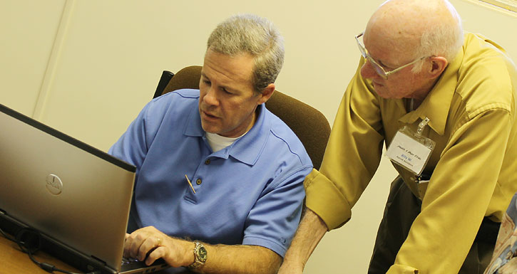 Pictured top: The new Health and Hope Clinic is located in the former Escambia County Health Department building in Century. Pictured top inset: Nurse Michelle Benauer checks the blood pressure of Tammy Lewis of Bratt on a recent visit to the new Health and Hope Clinic in Century. Pictured bottom inset: An exam room at the clinic. Pictured below: Executive Director Rick Hollis discusses clinic details with volunteer Billy R. Ward of Bogia. NorthEscambia.com photos, click to enlarge.