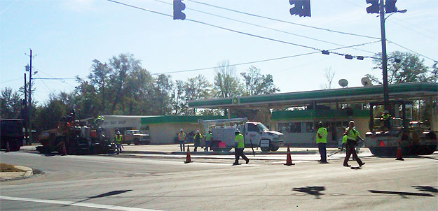 Road construction at Century’s only intersection with a traffic signal created delays on Saturday. Crews were working to resurface a potion of State Road 4 at North Century Boulevard (Highway 29). NorthEscambia.com photo, click to enlarge.