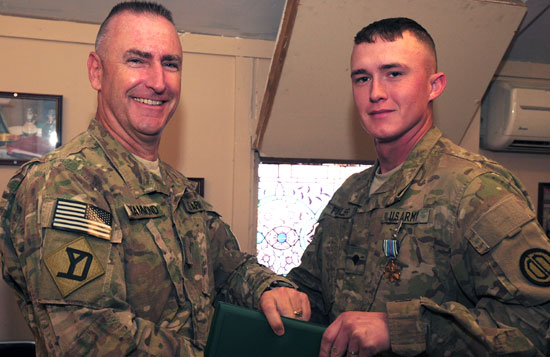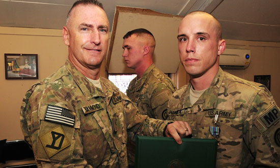 Pictured top: Sgt. Chest Tolbert of Jay, a member of the 1165th Military Police Company, helps an Afghan National Police officer detect vehicle threat indications in the heart of downtown Kabul last early last month. Pictured inset: U.S. Army Spc. Daniel Fowler of Brewton, also a member of the 1165th, receives a Joint Service Achievement Medal and a combat action badge. Pictured below: U.S. Army Spc. Brandon Hammock of Brewton was also awarded the medals. Photos by Petty Officer 1st Class Chris Fahey for NorthEscambia.com, click to enlarge.