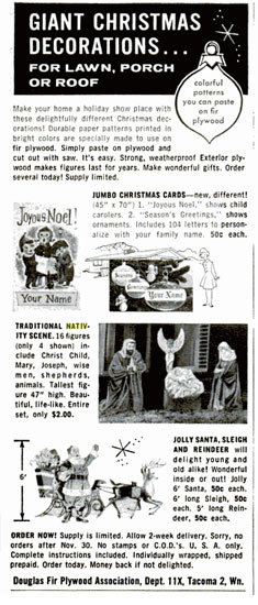 “Durable paper patterns printed in bright colors are specially made to use on fir plywood,” is how an ad in a 1959 Popular Science magazine describes the set. “Simply paste on plywood and cut out with saw…Exterior plywood makes figures last for years.”