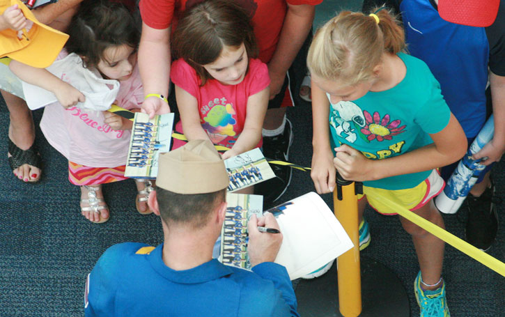 A member of the United States Blue Angels signs autographs after a later summer practice at Pensacola NAS.