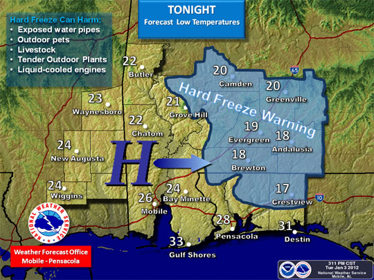 There is hard freeze warning in effect for the north Escambia area tonight.