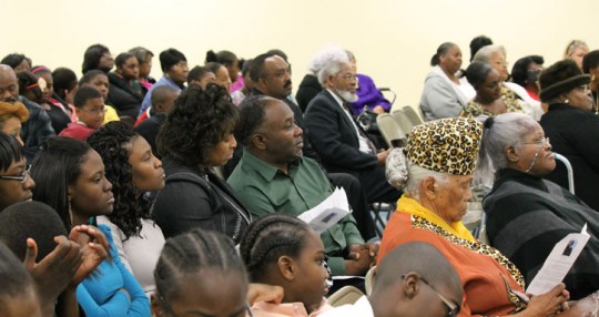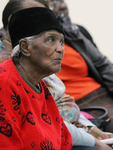 Pictured top: Attendees join in a chorus of “We Shall Overcome” during a Martin Luther King, Jr. program in Century Monday morning. Pictured top inset: Leola Robinson listens to a speaker during the program. Pictured bottom inset: A musical performance. Pictured below: Dozens of Century area residents attended the program. NorthEscambia.com photos, click to enlarge.