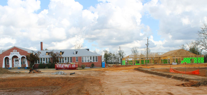 Pictured top: A new 7,000 square foot building that will house the county tax collector and property appraiser offices. Pictured inset: Work on the old Molino School. Pictured below: The new building is located to the right of the 72-year old building. NorthEscambia.com photos, click to enlarge.