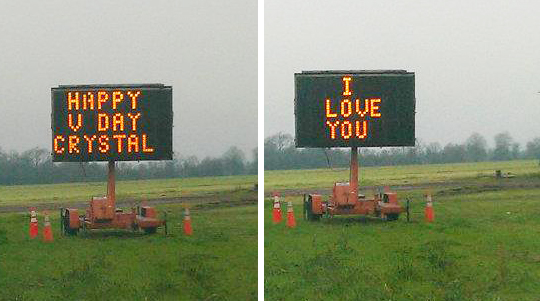 The sign proclaims for all traveling Highway 97 to see — “Happy V Day Crystal…I Love You”.