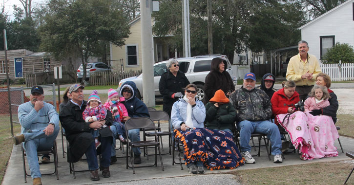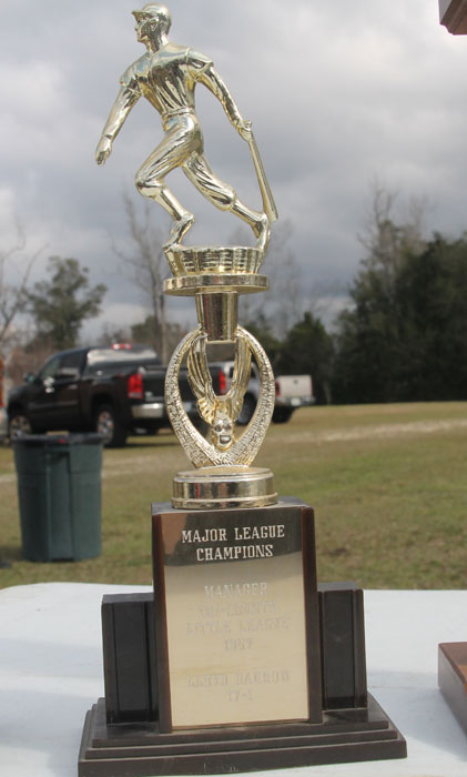 Pictured top: Lloyd Barrow at the dedication of Lloyd Barrow Field in Century Saturday morning. Pictured inset: A 1967 Major League Champions trophy marking a 17-1 run. Pictured below: A portion of the small crowd braved a cold wind for the dedication. NorthEscambia.com photos, click to enlarge.