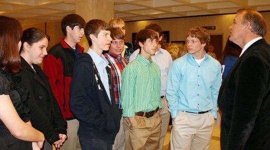 Pictured top: EREC Youth Tour delegates on the steps of the Capitol — (front, L-R) Lauren Griswold, Kathryn English, Carly Owens, J. D. Atkins, Aaron Floyd and Jacob Burnham, (back row) Brett Campbell, Joshua Gilmore, Courtney Lambert, Sandy Rainwater, Camille Driver, Chanda Hawthorne, Evan Goodson and Logan Rowell. Pictured below: Rep. Doug Broxson meets with Youth Tour participants. Submitted photos for NorthEscambia.com, click to enlarge.