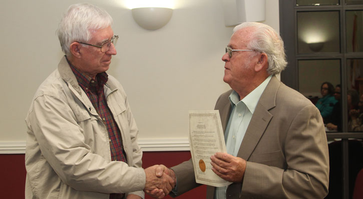 Pictured top: Century Mayor Freddie McCall (right) presents a proclamation Floyd Adams Monday night. NorthEscambia.com photo, click to enlarge. Pictured below: Adams at the Tate Aggies head coach in an undated photograph.